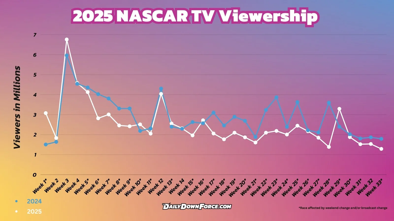 Though data for the latest Kansas race has not been released, the three prior races attracted fewer than two million viewers each—Gateway had 1.53 million, Bristol 1.54 million, and New Hampshire 1.29 million.